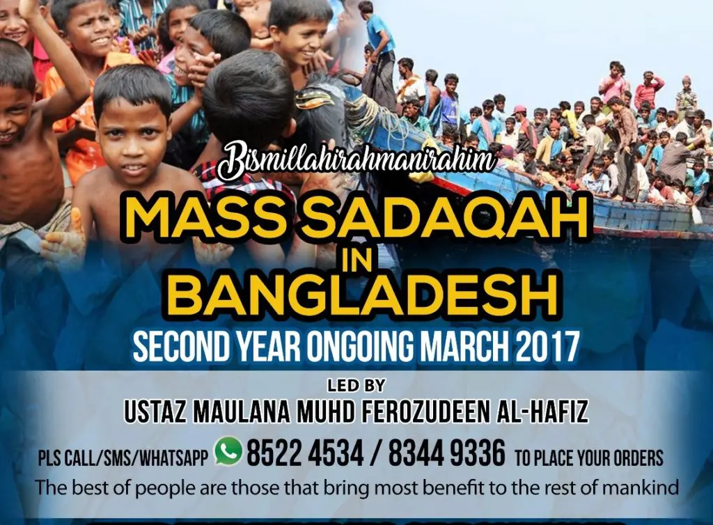 This is Mass Sadaqah Bangladesh 2017 performed by Al Falah Academy SG. By the grace of the Almighty, It took place in Chittagong, Bangladesh on 18th March 2017 at Madrasah Shariatul Uloom. It was supported and contributed by very good hearted Singaporeans where we managed to feed around 1300 Families.