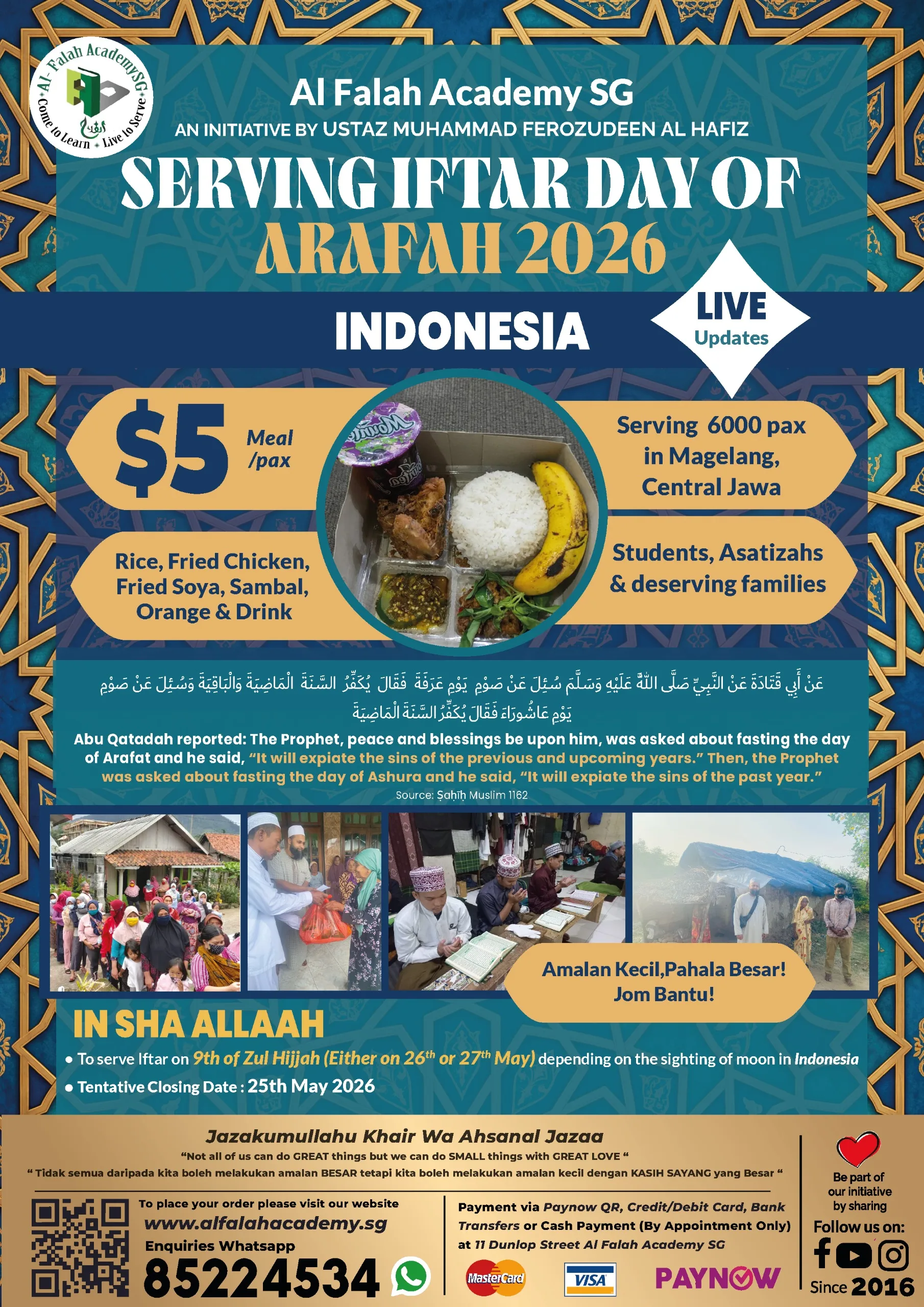 Prophet s.a.w urged us to increase our good deeds during the first ten days of Zulhijjah. Fasting is highly encouraged during the first nine days. The students of (deen) Islamic knowledge and teachers, fast on this blessed day, let’s earn the reward of feeding them. A meal of rice, meat, vegetables, fruits and drinks will be served as Iftar. Let’s feed those who are fasting!