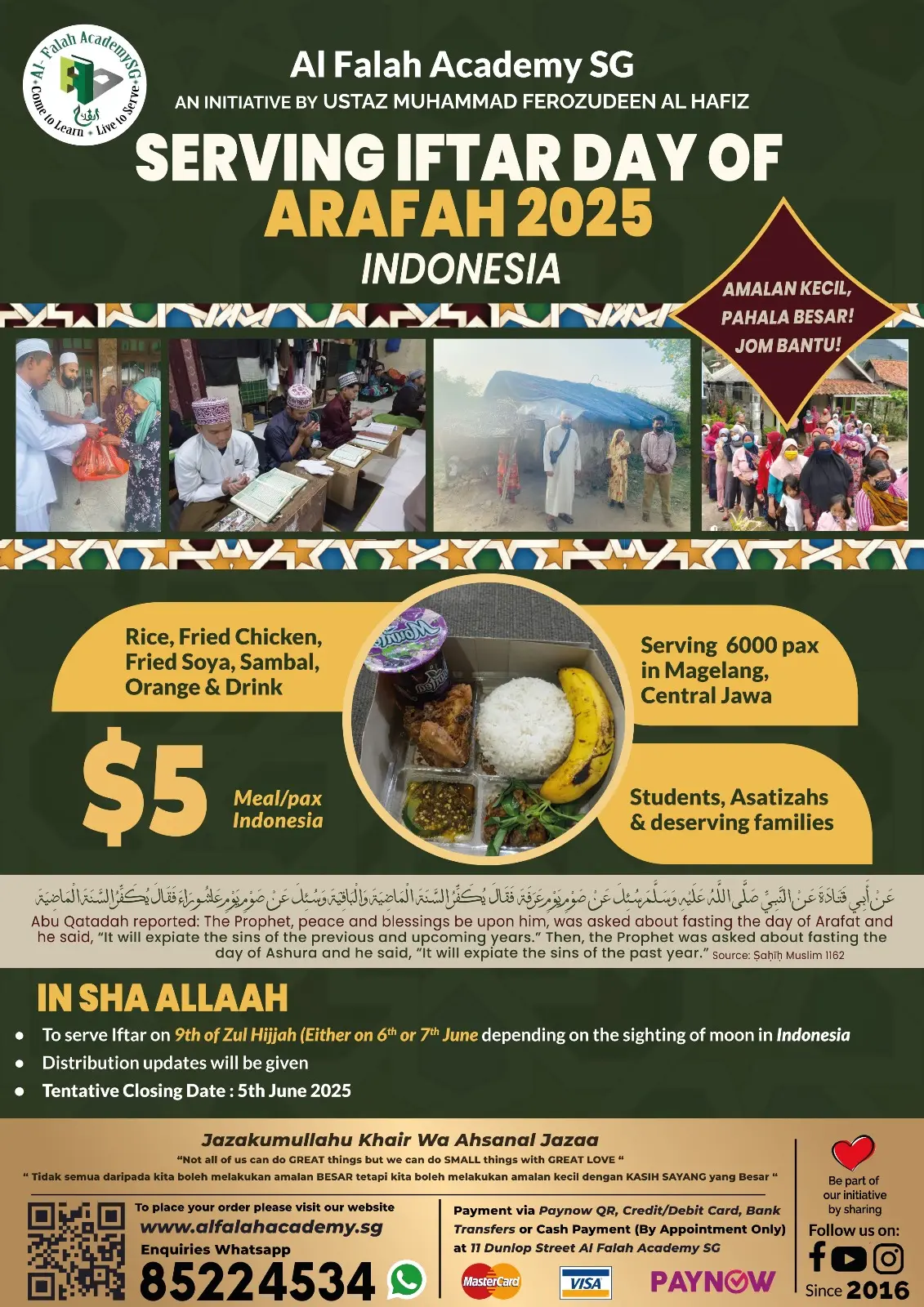 Prophet s.a.w urged us to increase our good deeds during the first ten days of Zulhijjah. Fasting is highly encouraged during the first nine days. The students of (deen) Islamic knowledge and teachers, fast on this blessed day, let’s earn the reward of feeding them. A meal of rice, meat, vegetables, fruits and drinks will be served as Iftar. Let’s feed those who are fasting!